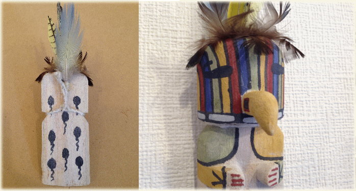 とても古い精霊。カラフルな顔の色は虹を表しています。ホピのダンス、儀式には欠かせない存在ですが、 本来の役割は人々の浄化を促すことが本来の役割。 大人子供、関係なくユッカという植物の束で、容赦無く魔を払い出します。 魔を追い出し浄化作用のある働きをする、古い精霊です。