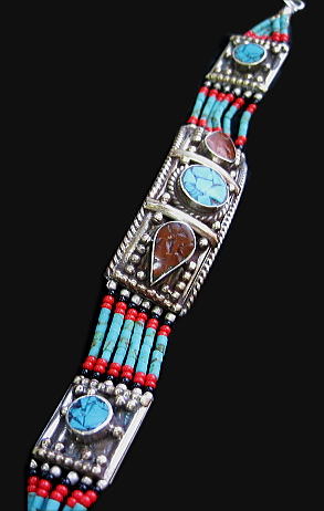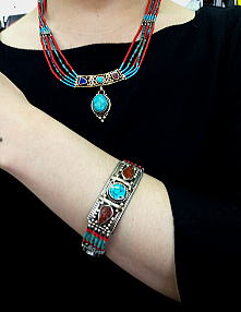 山さんごとターコイズのビーズが贅沢にあしらわれ、繊細な銀細工の中に目を引く石が埋め込まれています。