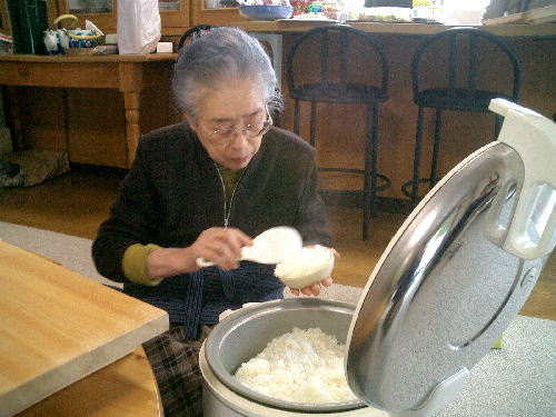 3日目、「森のイスキア」へ。初女さんが一人ひとりに よそおってくれたご飯。
